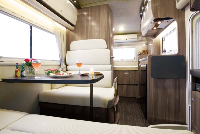 エントランスは中央で、前部に対座ダイネット、後部にハイマウントダブルベッドの構成。