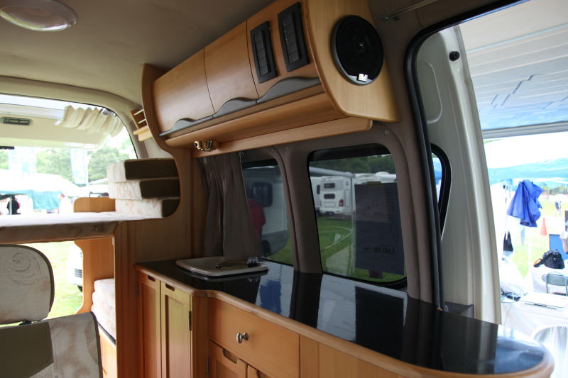 x 800mのベッドとなるため、身長方向にも十分な余裕が生まれる。下段は1,700mm x 800mmのベッドとなる。もちろんベッド展開しない場合は、広大な収納スペースとなる。1名で就寝の場合は、上段だけベッド使用にし、下部は収納スペースとすることもできる。ただし、この場合にはダイネットとの間に仕切りが無いため、荷物は見えてしまう。下段を常時収納庫として使用することが分かっている場合は、扉などを設置すると良いかも知れない。後部二段ベッドスペースは適度な個室感があり、落ち着いて就寝できる空間である。また、上段ベッドからは、エクステンションボックスに開けられた丸窓から外を見ることができるが、まるでヨットの船内にいるような気分が味わえる。上段ベッド頭上にはマガジンラックも備え付けられており、就寝前の読書家にはうれしい装備となる。