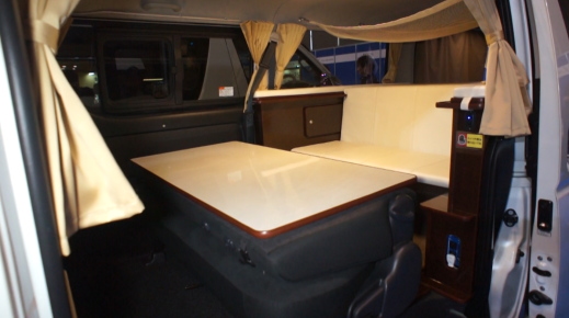 ハイエースやNV350キャラバンの標準ボディを使ったバンコンは数多くあるが、FOCSエスパシオのようなレイアウトは珍しい。