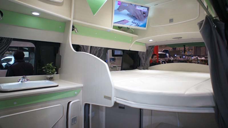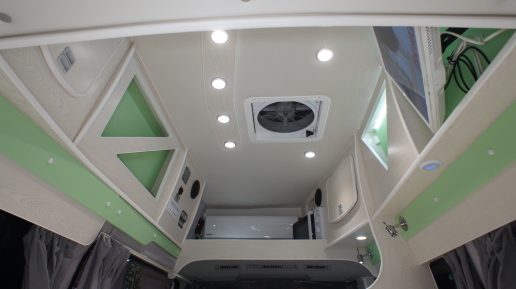 レイアウトは前部にギャレー、後部は全面に縦置き常設ハイマウントダブルベッドを装備、厚めのマットレスを使った本格的なベッドになっている。
