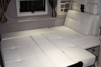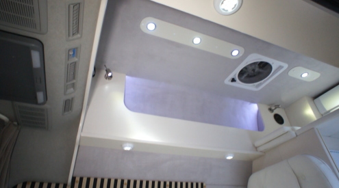 レイアウトは前部に対座ダイネット、中央にギャレー、その向かいに冷蔵庫、最後部はユーティリティールームと収納スペースとなっている。