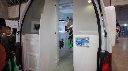 ボディを見ると、NV350バージョンと同様、ハイルーフの架装が施されており、天井高は約2mで大人が立って歩ける。