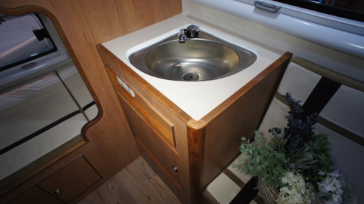 キッチンは楕円形のシンクがビルトインされているだけで、極めてコンパクト。