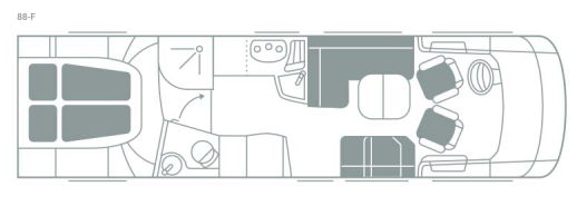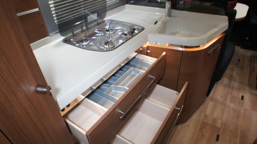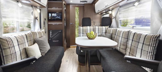 レイアウトは、前部にダイネット、後部にベッドルーム、中央にギャレーとサニタリールームという、欧州車お決まりのもの。