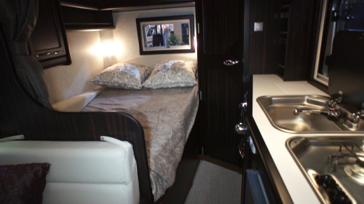 レイアウトは、前部にラウンジソファダイネット、後部に縦置きダブルベッドを配置。