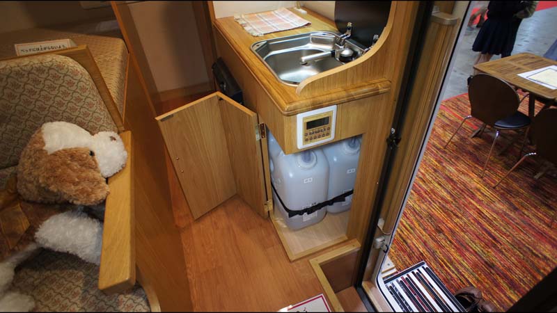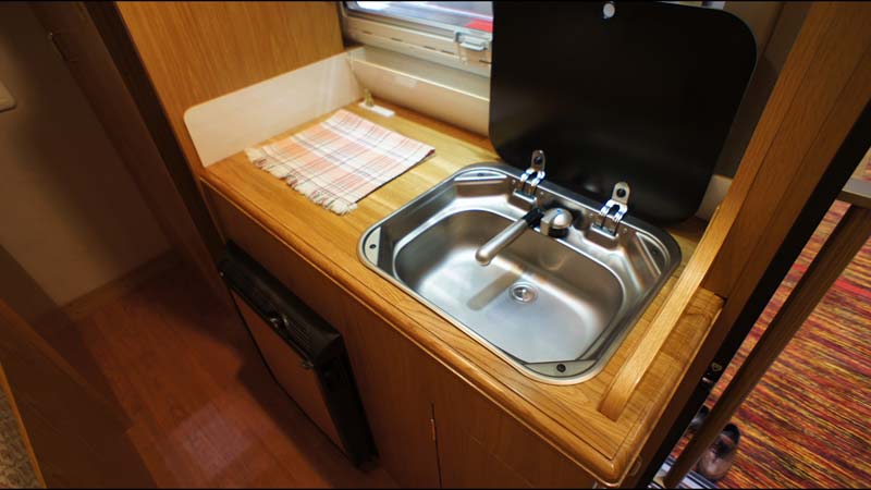 ギャレーは、共通で(ボーノAを除く)、十分な広さのシンクと、その下には各20リッターの給排水タンクが収納されている。