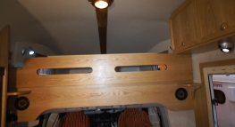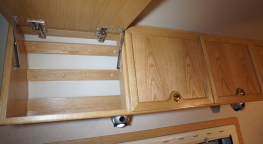 収納は、ダイネット上、ギャレー上などの多くのオーバーヘッドキャビネットがあり、大変便利。(写真下左)