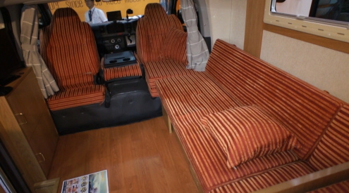 ただし、このレイアウトは、ボーノのどのレイアウトとも異なり、ダイネットは運転席、助手席のシートバックを利用した後ろ向きシートと、縦置きのロングソファの組み合わせ。(写真下)