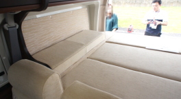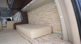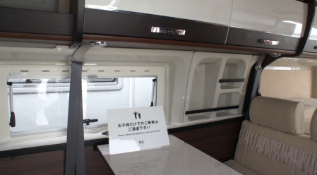 ベッドは後部のハイマウントダブルベッドが常設メインベッドで、エクステンションウインドウのおかげで車幅方向に就寝できる。(写真下)