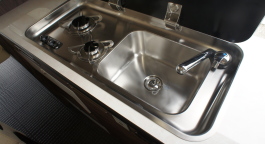 ギャレーは、2口コンロとシンクが一体になったコンビネーションタイプで、本格的なもの。