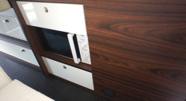 ギャレーコンソールには電子レンジと39リッター冷蔵庫が標準でビルトインされる。(写真下右)