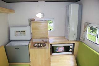 軽キャンパーでは類を見ない、本格的なギャレーで、丸型のシンクが中央に据えられており、大き目の食器でも洗うことができる。