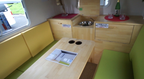 ベッドはダイネットを展開する形式だが、対座シートの間を背もたれで埋めるだけなので、比較的簡単にベッド展開できる。