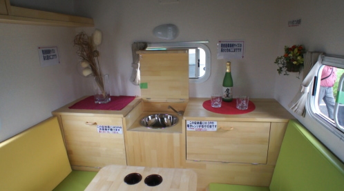 レイアウトは縦置き対座形式の二の字型ダイネットと、後部のギャレーコンソールで構成される。(写真下)