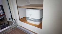今までのフルコンなら、少なくともカセットトイレが装備されていたが、エヴァンスポーツではポータブルトイレに割切っている。
