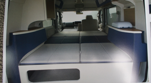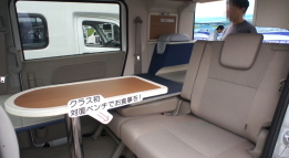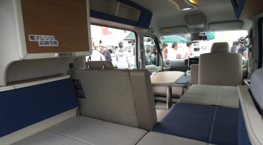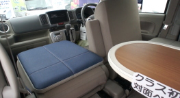 軽キャンパーのダイネットは、ほとんどの場合、ベース車のシートを畳んで、その上にボードを乗せ、フラットなフロア、あるいはベッドを作り、その上にテーブルを置くという、いわゆる「ちゃぶ台」スタイルを採用している。