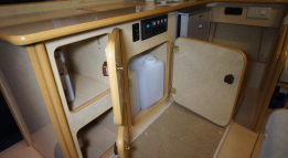 前部のギャレーは、コンパクトなシンクと49リッターの冷蔵庫が標準でビルトインされる。