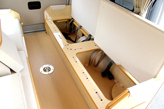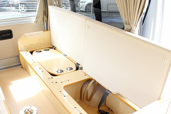収納は、シート下が収納庫になっており、テーブルもここにすっきり収納できる。