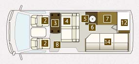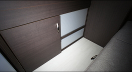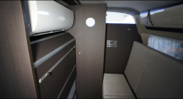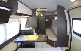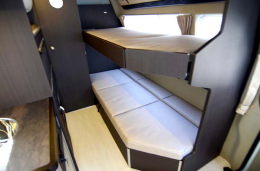 レイアウトは、前部に対座ダイネット、後部に縦置き2段ベッドと、その向かいにギャレーとエアコン室内外機を収納したコンソール、そして最後部にシャワールームとしても使えるユーティリティールームで構成される。
