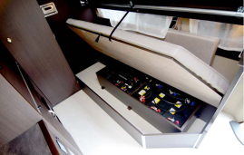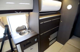 ギャレーは、丸型シンクが埋め込まれ、下には49リッターと大き目の冷蔵庫が標準で収納される。