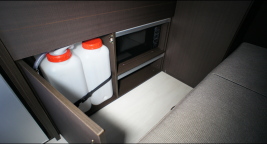 また、電子レンジと各20リッターの給排水タンクはエアコンのコンソールの最下部に収納される。