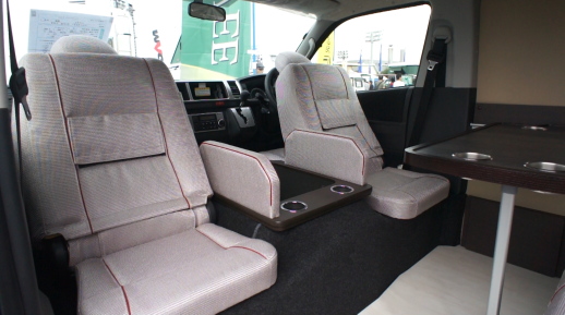 ファイブスターでは、フロントシートのシートバックを前に倒し、これを後ろ向きシートとすることで、ダイネットスペースを確保している。