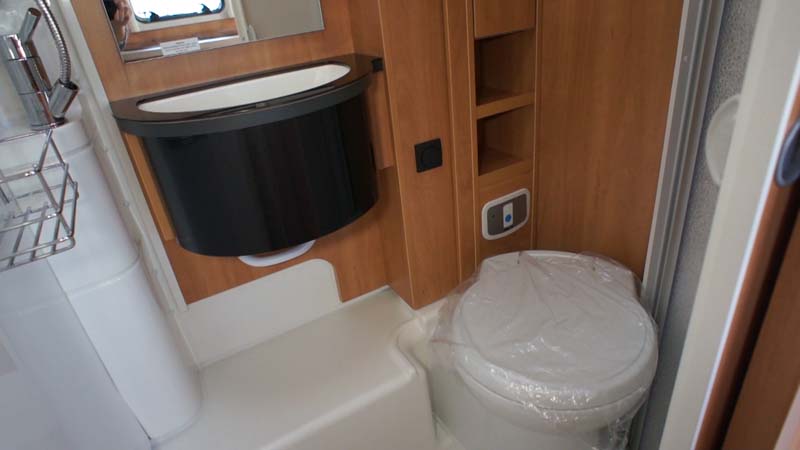 サニタリールームは、10リッターのボイラーが標準装備され、温水シャワーが標準で使えるのが欧州車らしいところ。