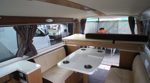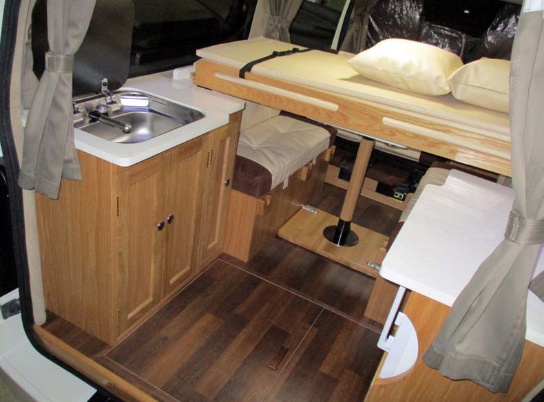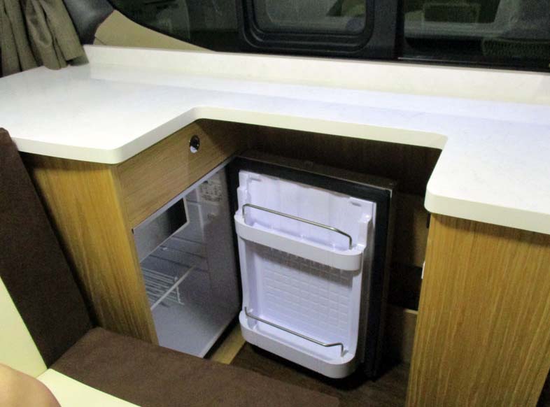 ギャレーが後部にある理由は、床掘り下げによって8ナンバー登録としたためであるが、シンクは無しか小型でも良いので、シンクと電子レンジが冷蔵庫と同じコンソールに収まればよかったかもしれない。(この場合は8ナンバーではないが)