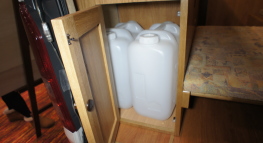 その下には、各20リッターの給排水タンクが収納されているが、これらのタンクはリアハッチを開けると、すぐに取り出すことができる。
