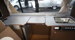 冷蔵庫は正面(シート方向)には向いておらず、シンクの方向に置かれいるが、天板の中央がへこませてあるので、むしろアクセスし易い。