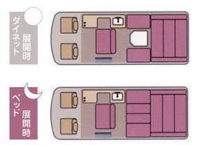 子供は先に後部ベッドで就寝しても、大人はダイネットで寛ぐことができる。