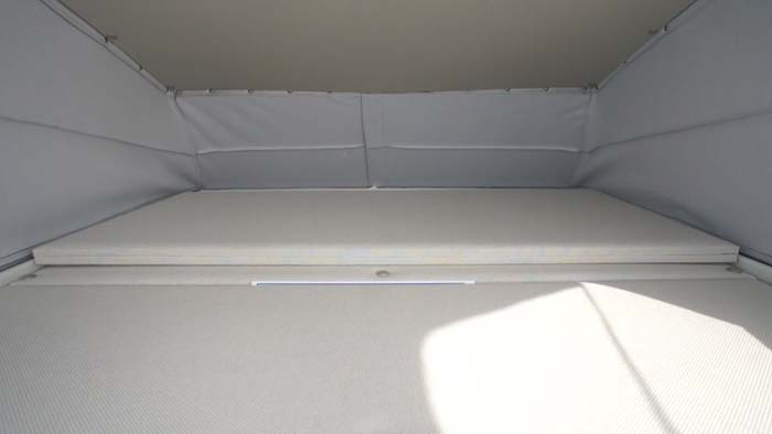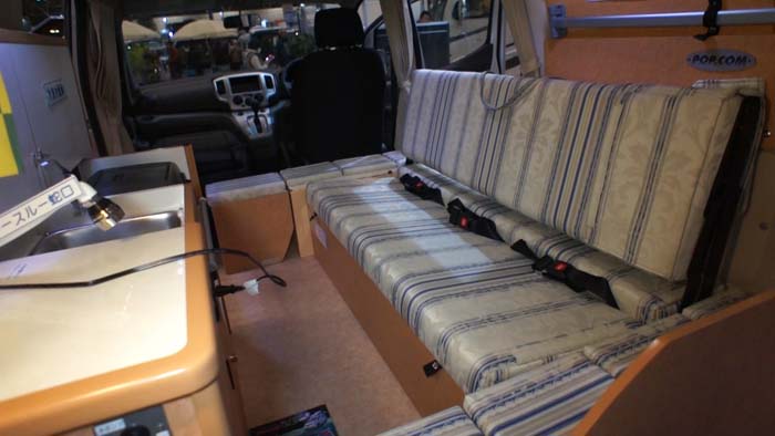 このシートは優れもので、背もたれをスライドさせることにより、ワンアクションでベッドに展開できる。車内に出なくても展開できるので、雨の日などはありがたい。 ベッドはこのフロアベッドの他、ポップアップルーフを上げてルーフベッドを使用することが可能。