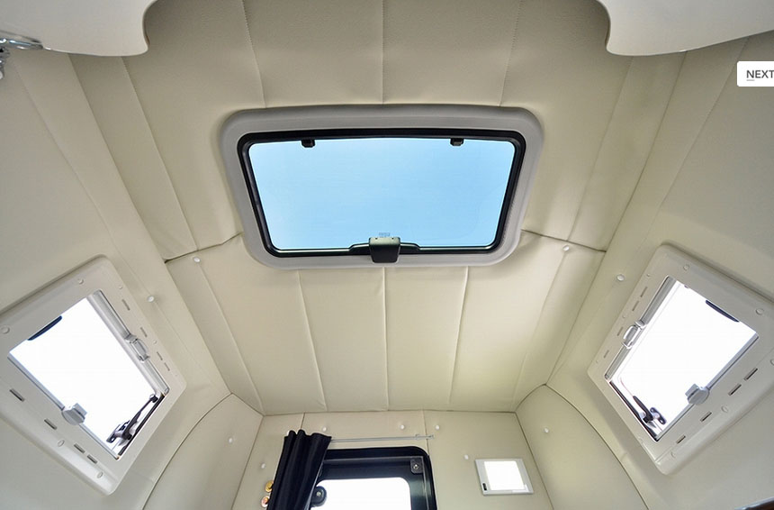 上部ベッドの後端のボードは跳上げることができるので、後部は天井高の高いダイネットとして寛ぐことができる。