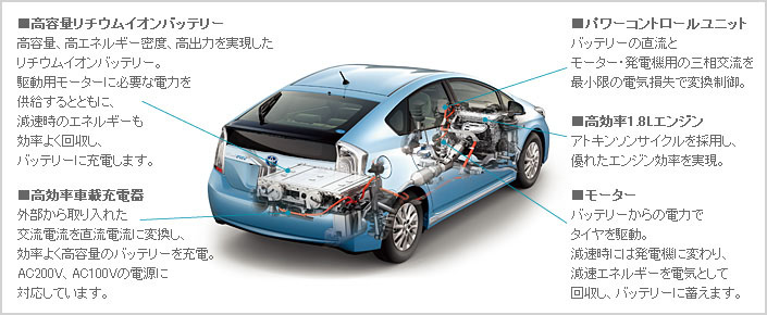プリウスPHVに積まれているバッテリーはリチウムイオンバッテリーで、プリウスPHVのウリのひとつが、このバッテリーの電力を外部に供給できることである。