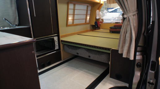その特徴は、ハイエースの室内に完全に再現された和室。