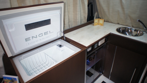 ギャレーには40リッターの上蓋式冷蔵庫、電子レンジが標準装備される。