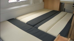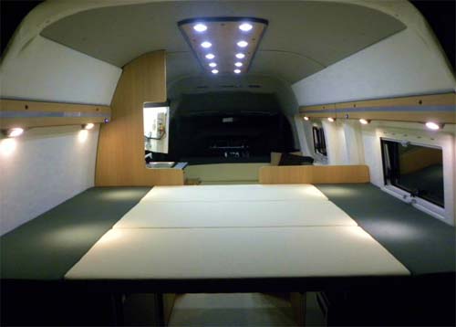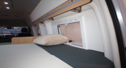 リアルでは上段ベッドと下段ベッドがクロスしていたが、リアルエボリューションでは、車長の長さを生かして、後部ベッドは完全に独立したハイマウントダブルベッドになっている。