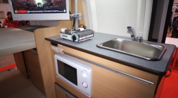 ギャレーコンソールには大き目のシンクがビルトインされており、コンロを置くスペースも設けられている。