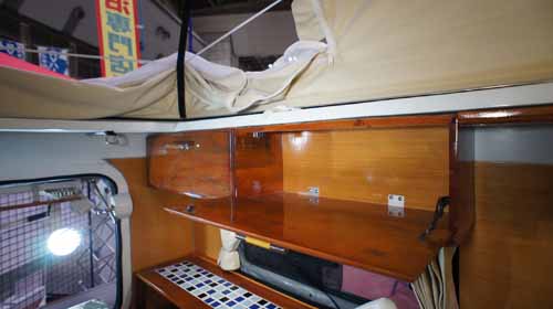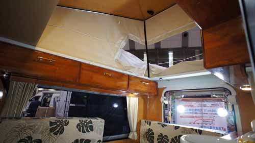 ルーフベッドでも大人2名が就寝できるので、計4名の就寝が可能なため、ファミリーでもゆったり就寝できる。(写真下右)