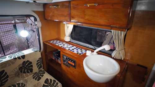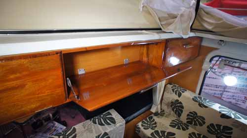また、給排水タンク収納部の扉を跳ね上げると、そのままギャレーコンソールの延長になり、広い調理台が出現するのは大変便利。