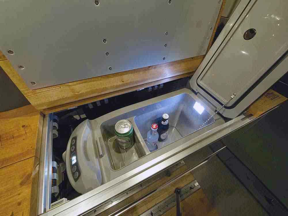 ギャレーの隣には、べバスト製40リッター上蓋式の冷蔵庫がビルトインされているが、これも標準装備である。