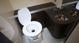 サニタリールームは、電動水洗式カセットトイレが標準装備され、更に温水シャワーも可能。