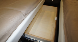 収納は、ダイネット、ベッドルームのオーバーヘッド収納の他、ベッド下の引き出し収納(写真下左)、それとは別に、ベッド下の大きなトランクスペースが用意されている。