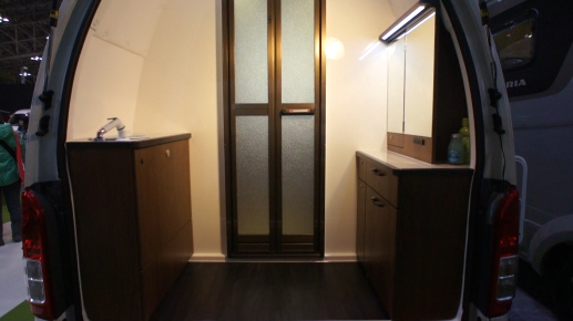 さて、同社のモデルには、最後部にFRPの完全防水のシャワールームを持つものがいくつかラインアップされている。