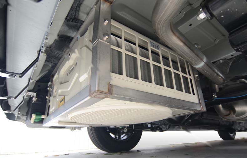 各社工夫して、ボディーサイドやルーフ上に取り付けているが、最近では、車両の後部床下に寝かして取り付けるモデルが多くなっている。