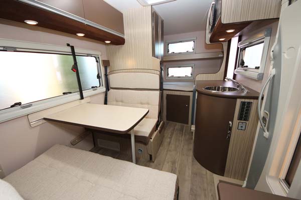 また、前部に対座ダイネット、後部にハイマウントダブルベッド、中央にギャレーとユーティリティールームを配するレイアウトも、大きく変わらないように見える。