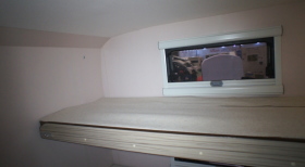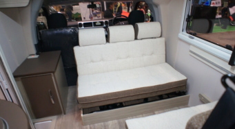 また、トムタンデムの後部ダブルベッドには、折り畳み式の上段ベッドが用意されており、これを使うと、ダイネットを展開するフロアベッドとダブルベッドも合わせて、計5名就寝できる。(写真下左右)