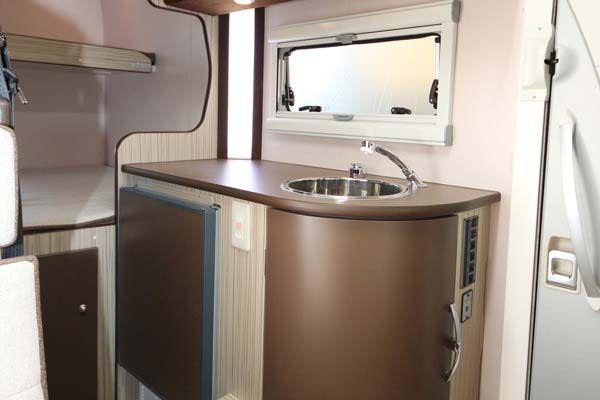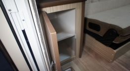 ギャレーコンソールは、どちらも丸型シンクのみビルトインされ、コンロはビルトインされていないので、卓上カセットコンロを置く必要があるが、トムバロンでは車長を生かし調理スペースは広い。(写真下右)