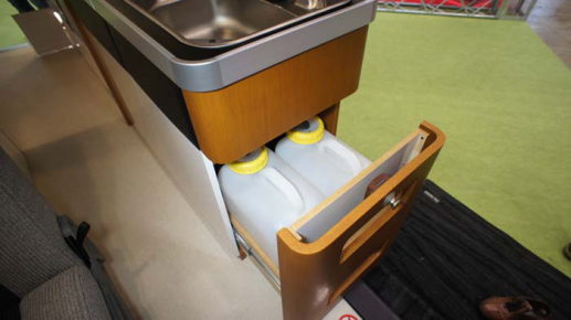 下には各13リッターの給排水タンクが収納されているが、車外からアクセスできるうえ、引き出して取り出せるので大変便利。