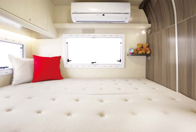 例えば後部ダブルベッドはプラスティックスプリングの分厚いマットレスが敷かれ、家庭用ベッドに劣らない寝心地を提供する。